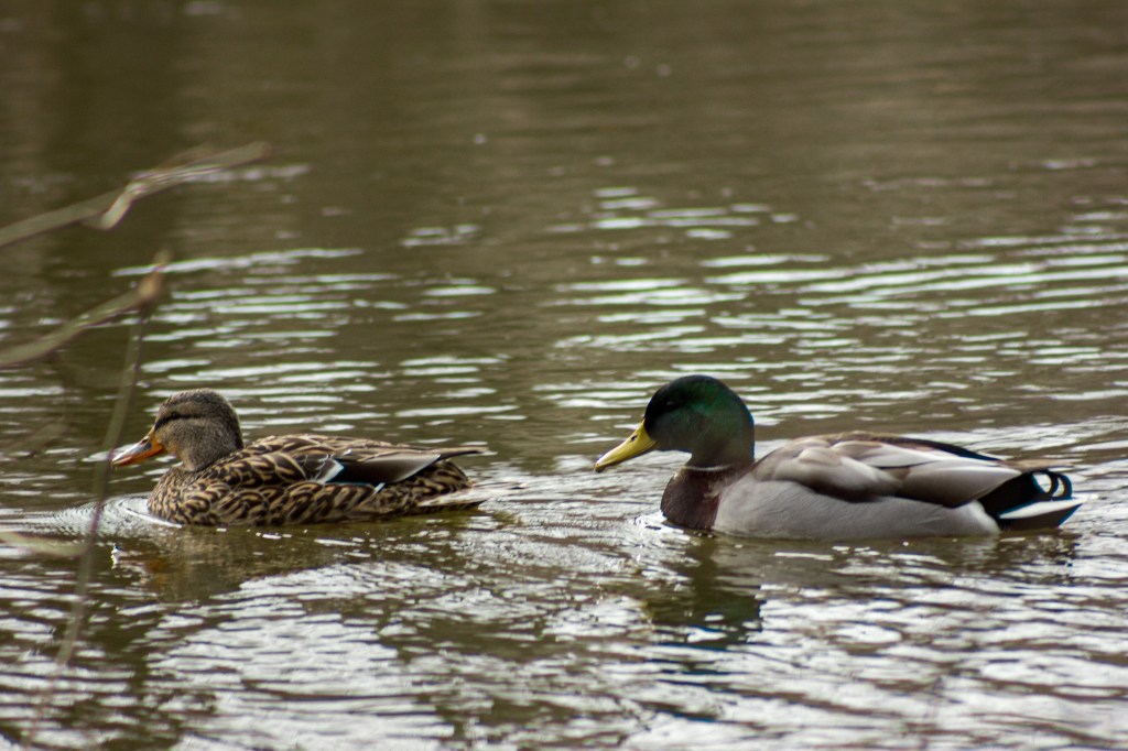- Male Mallard: The male (drake) is easily recognizable with its iridescent green head, bright yellow bill, chestnut-brown chest, and grayish body. It also has a striking blue patch bordered by white on its wings, known as a speculum.