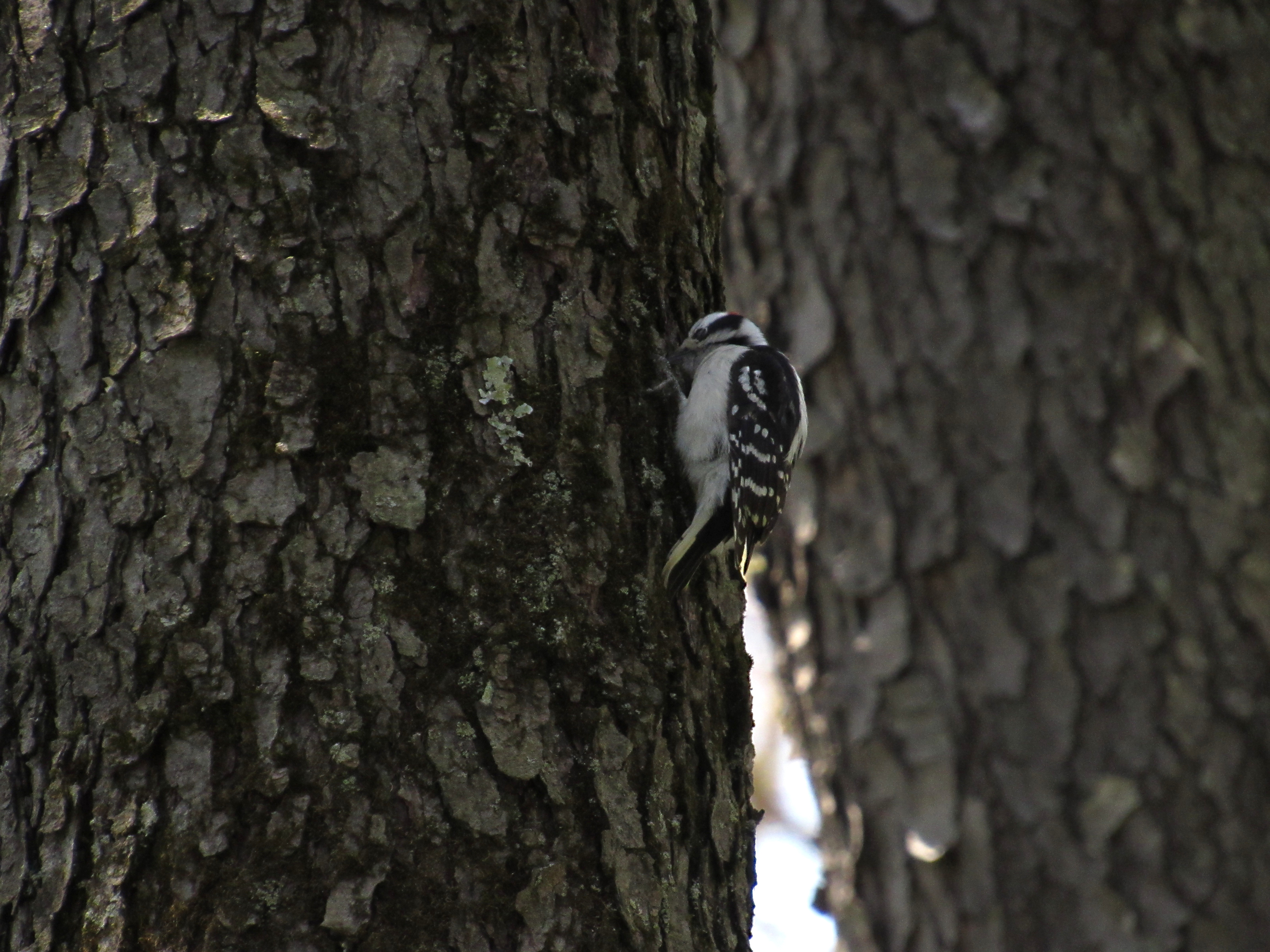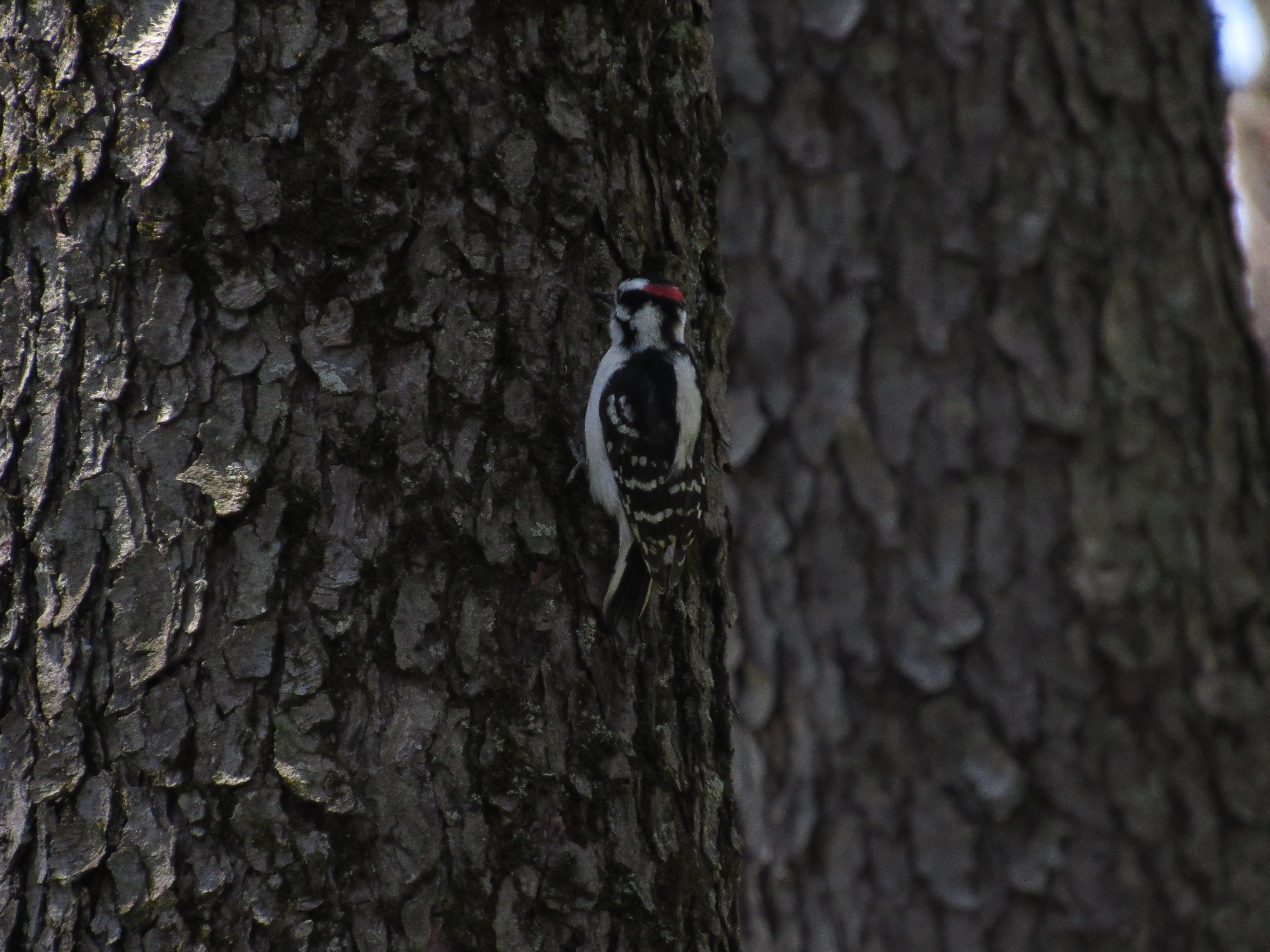 Coloration: Black and white checkered pattern on the wings. White underside. Black and white striped head. Males have a small red patch on the back of the head, while females do not. Short, chisel-like bill