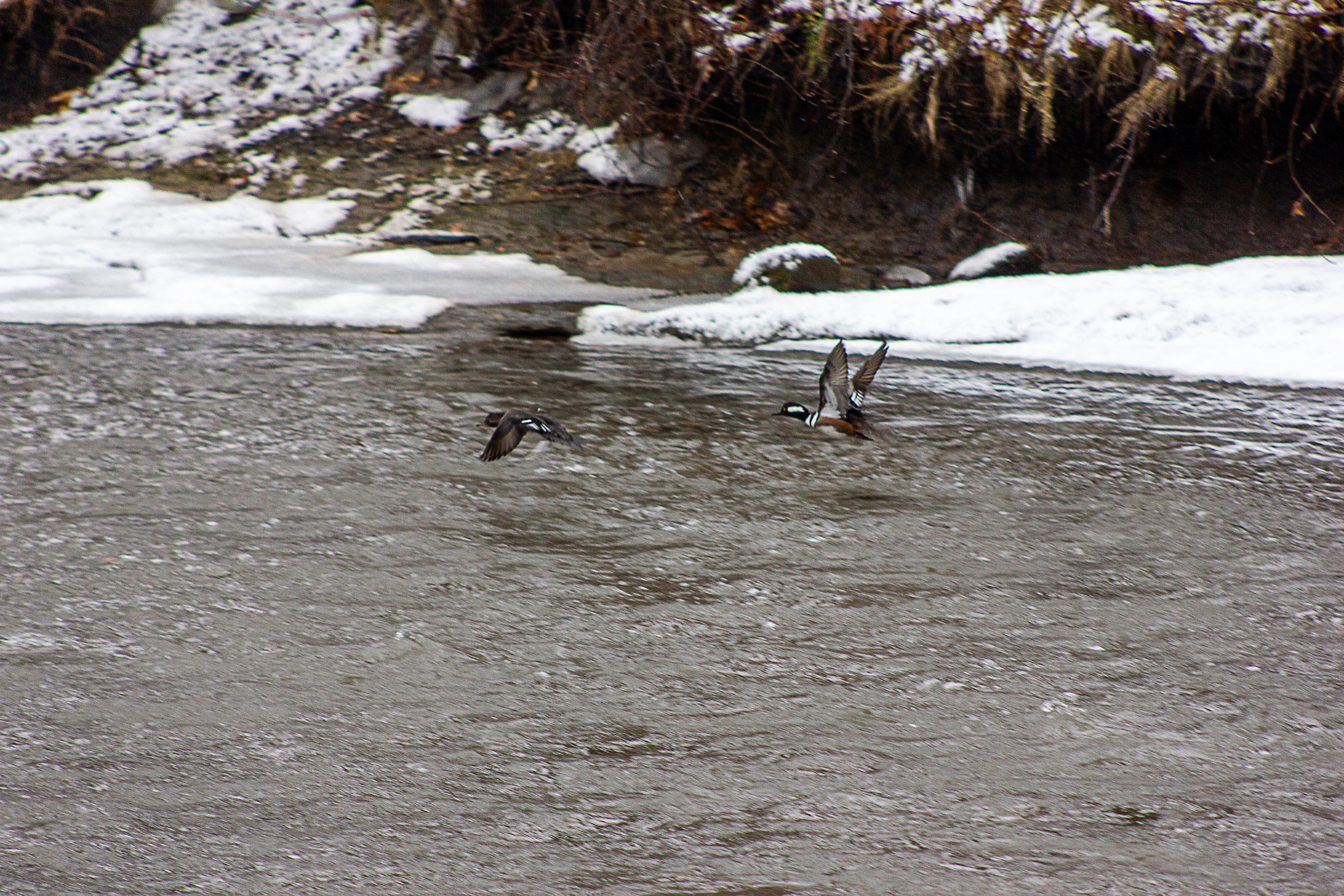 Plumage: Males: Black head with a white fan-shaped patch, golden-yellow eyes, and chestnut-colored sides. Females: Warm brown overall with a rusty-brown crest and duller yellowish eyes. Bill: Narrow, serrated, and slightly hooked, ideal for catching slippery prey.