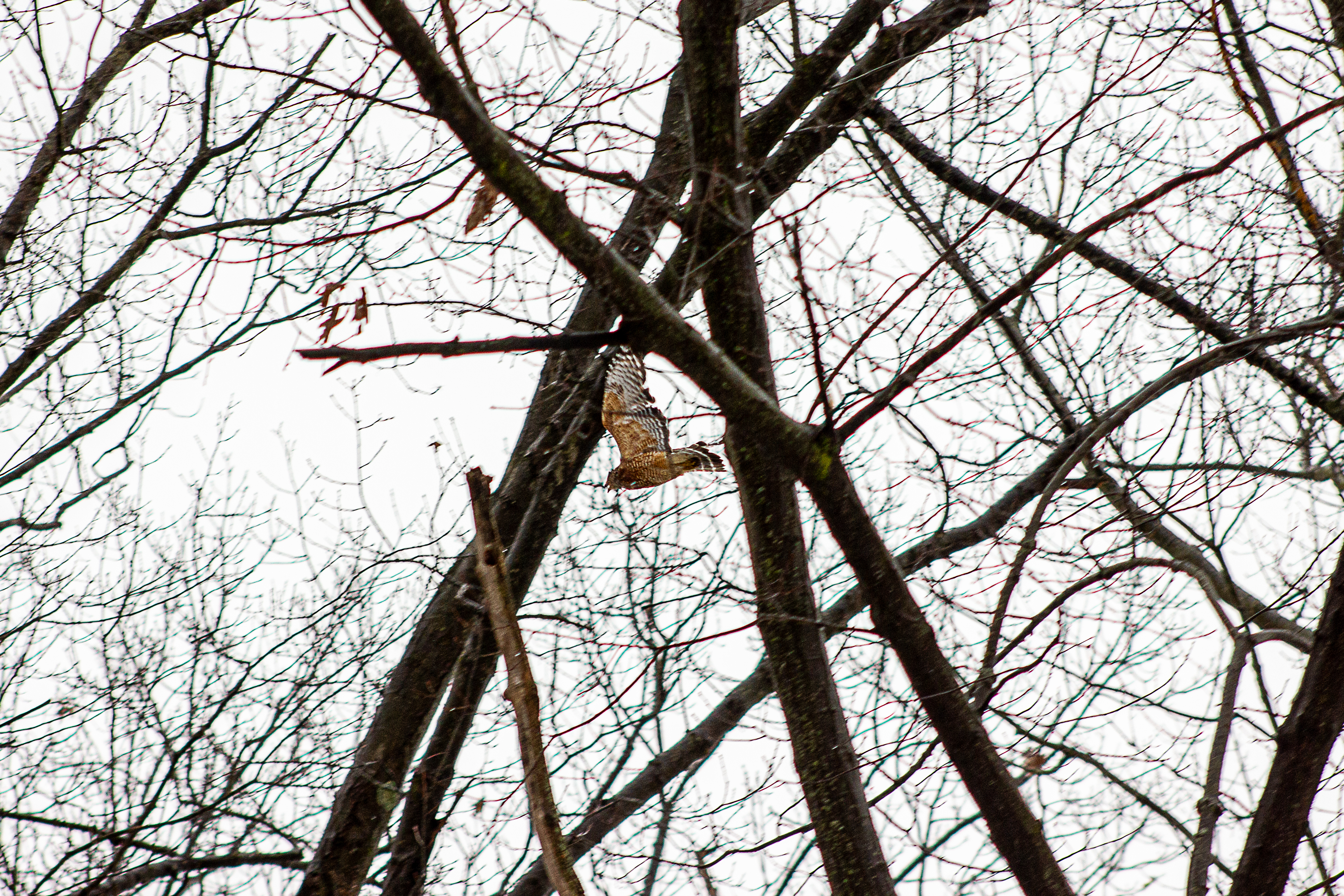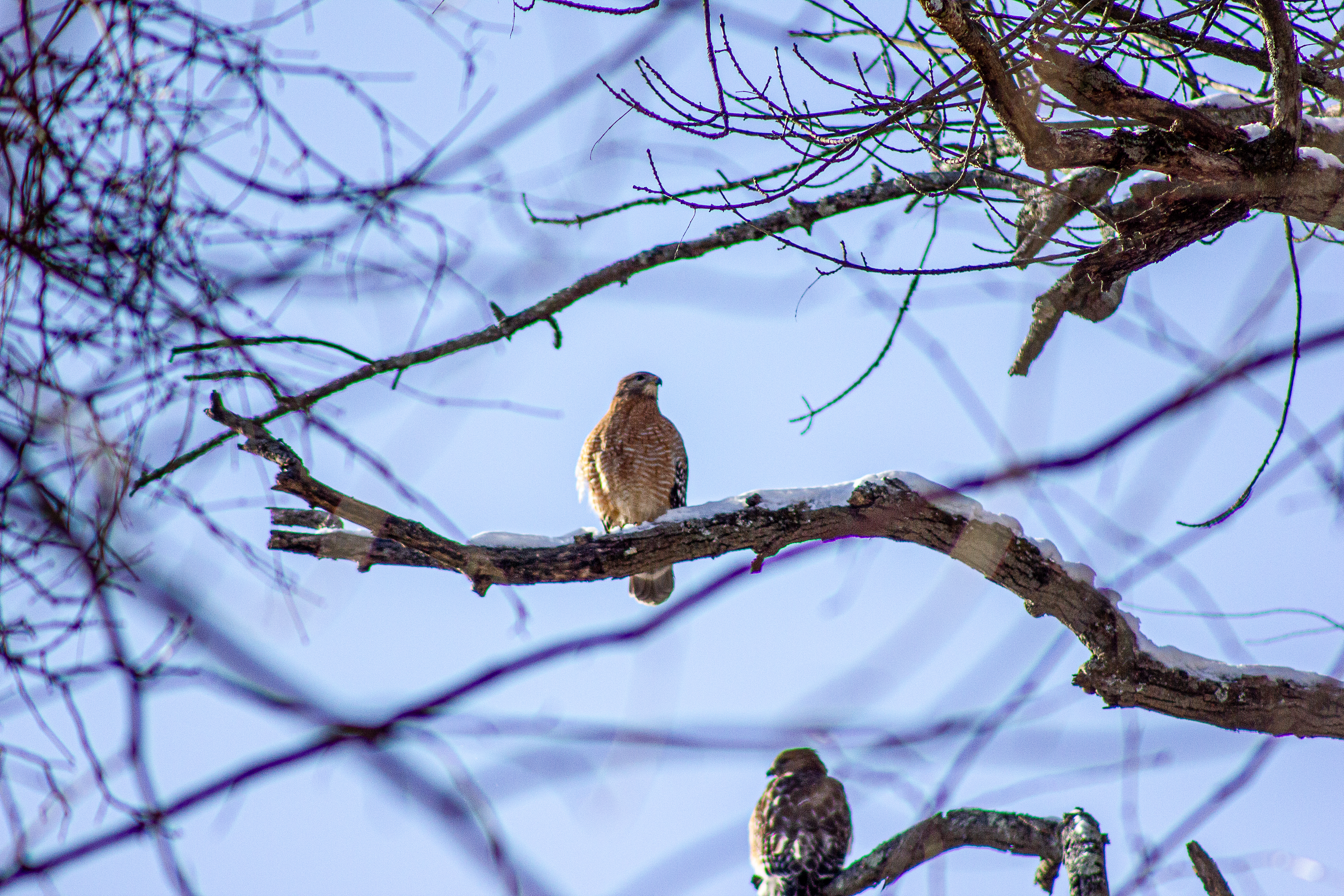 Red-shouldered hawks are known to coexist with crows, sometimes working together to drive away common enemies like great horned owls. Their keen eyesight allows them to detect prey from great distances. Blue jays frequently mimic their calls as a defense strategy.