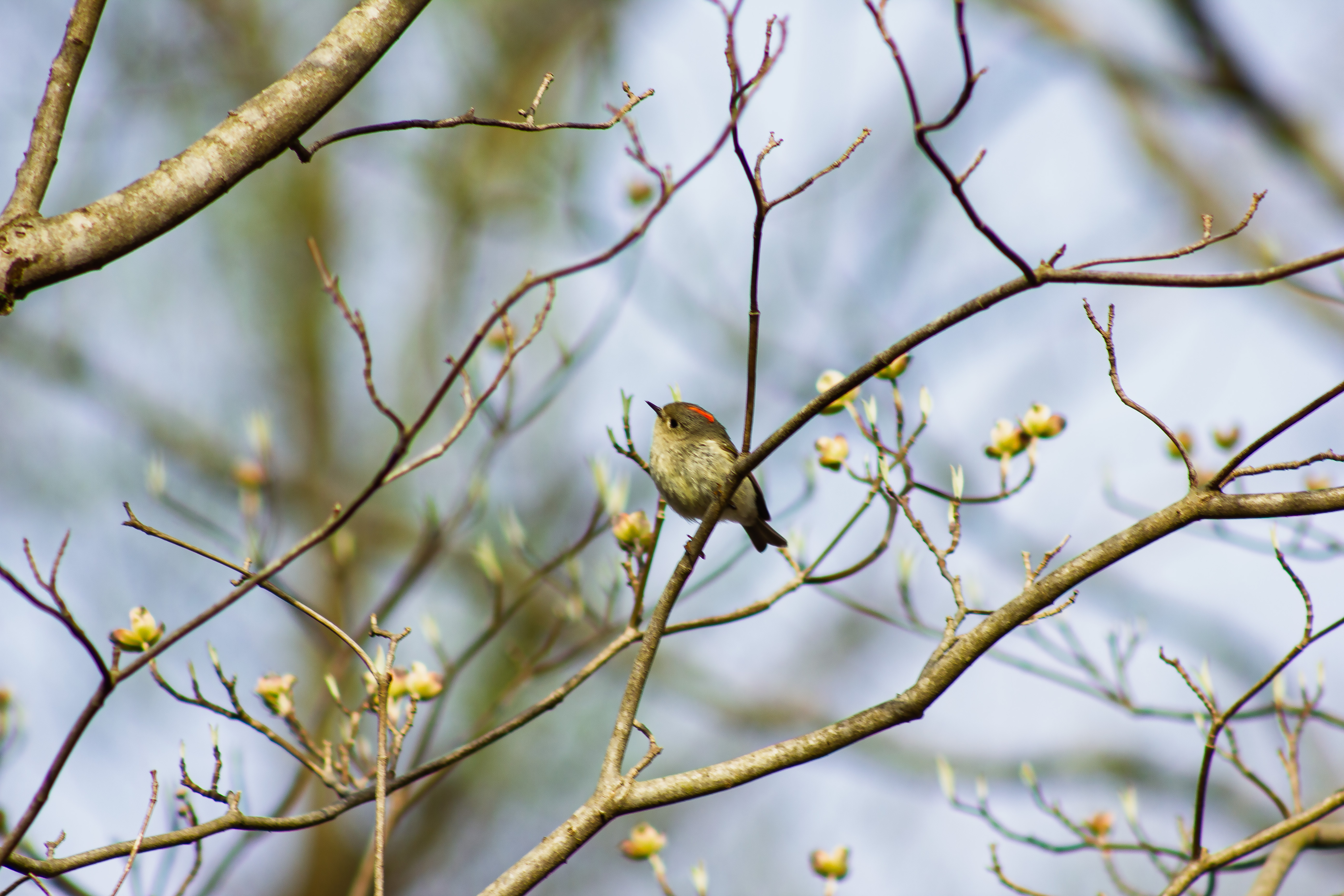 Males have a concealed ruby-red crown patch (hence the name), which they usually keep hidden unless agitated or excited.
