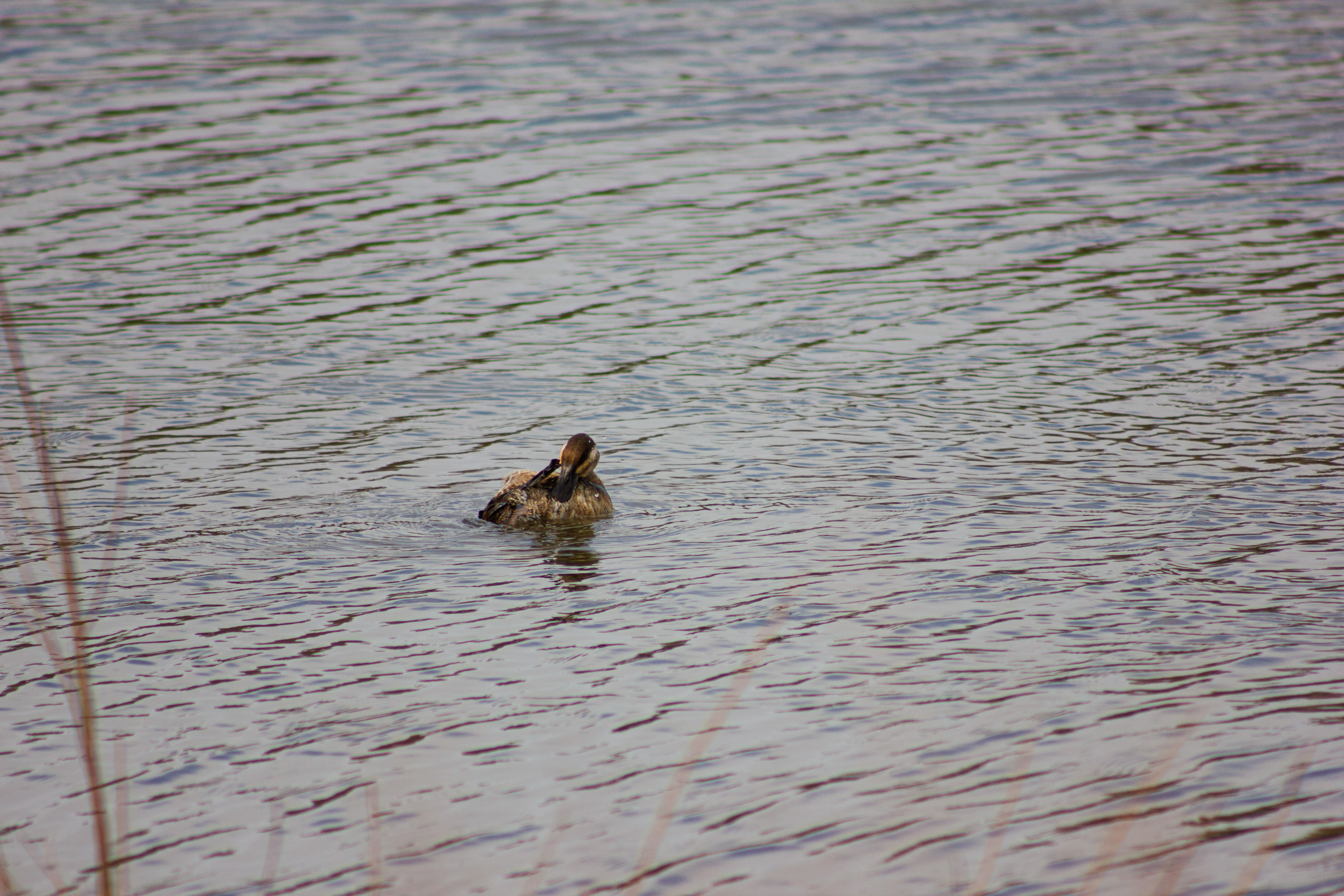 Breeding: Breeding season starts in late spring. Males perform elaborate courtship displays involving bill-bubbling and head-pumping. Nest is built by the female in dense marsh vegetation, usually a floating platform of plant material. Females lay 5–15 eggs, which are large relative to body size.