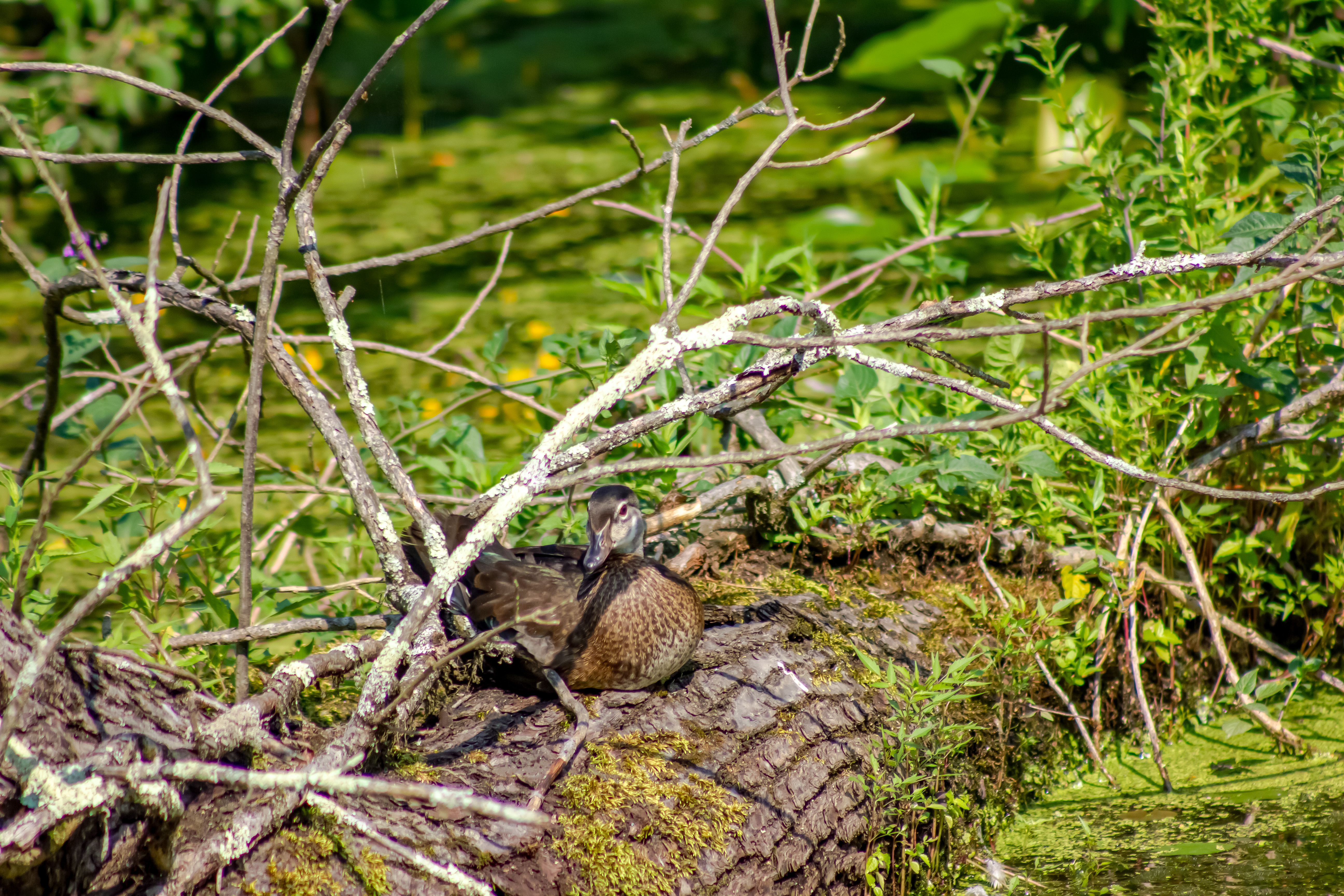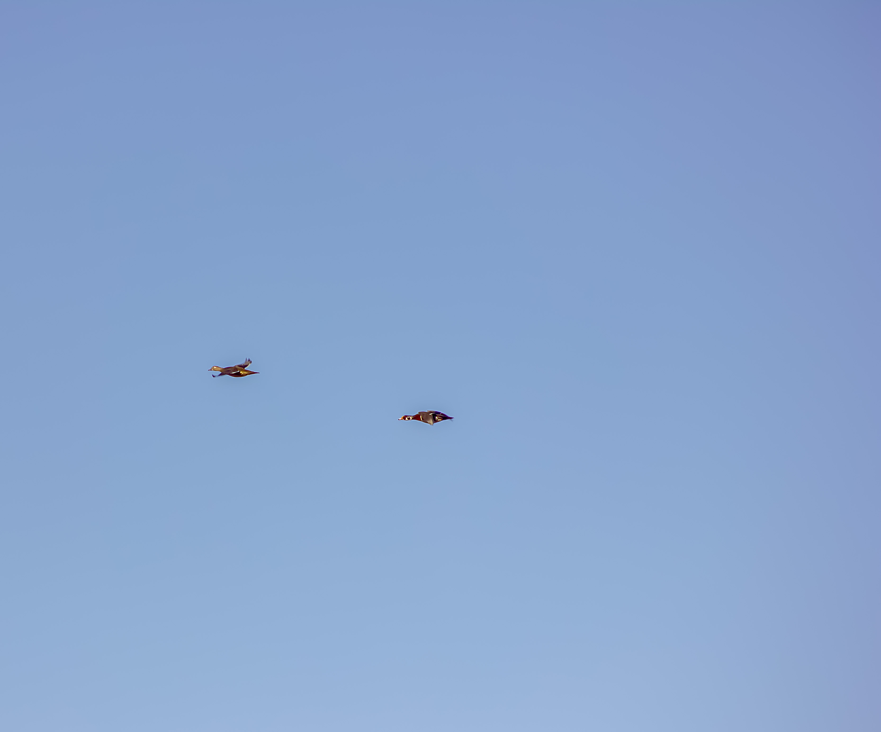 The Wood Duck is one of the only North American ducks that regularly nests in trees. Can fly through dense forests thanks to strong, broad wings and excellent agility.