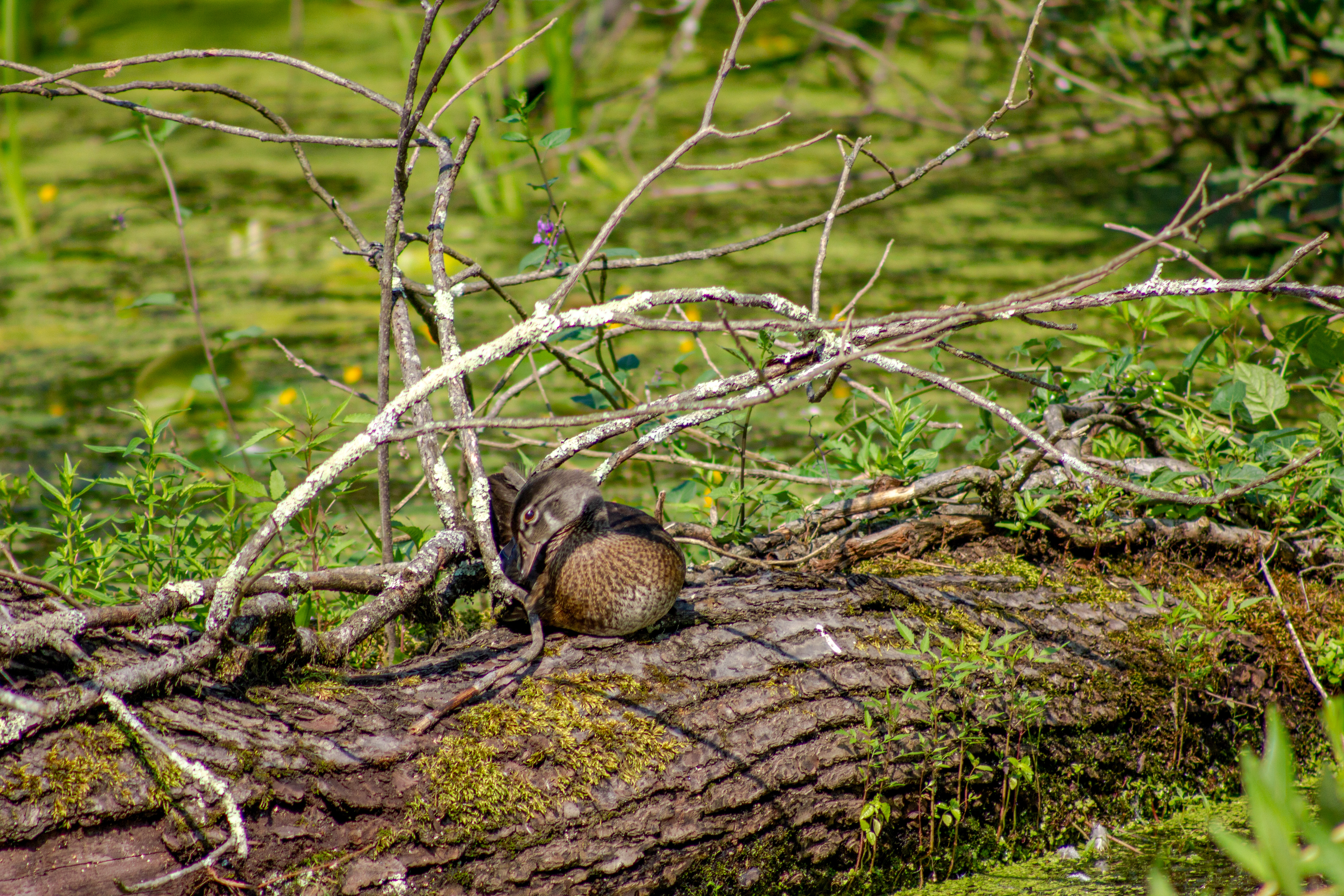 The scientific name Aix sponsa means “married duck,” referring to the male’s gaudy, tuxedo-like plumage. Highly territorial during breeding season—males often defend females from rivals. Ducklings’ first fall can be from over 50 feet high, yet they land unharmed due to their low mass and soft down