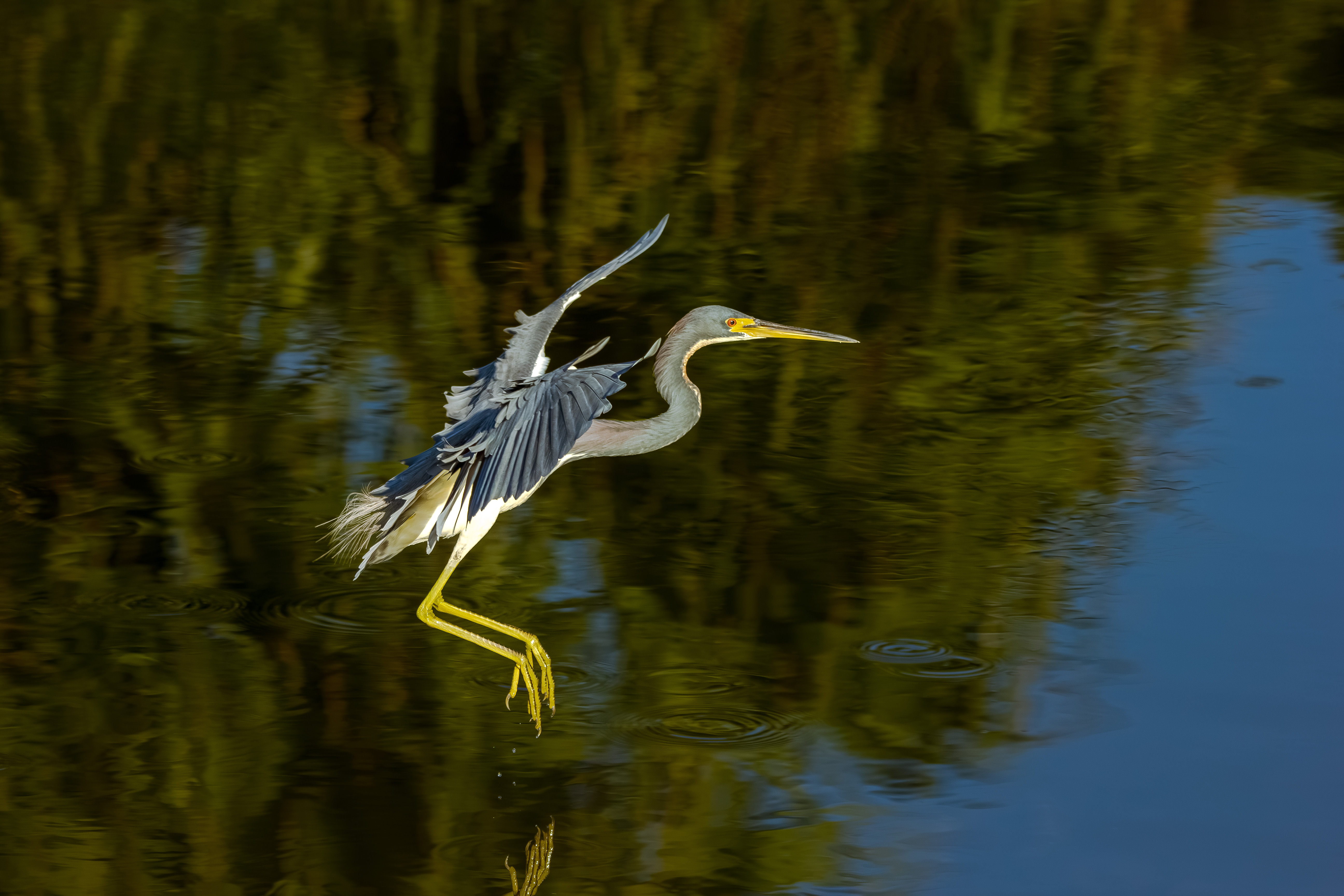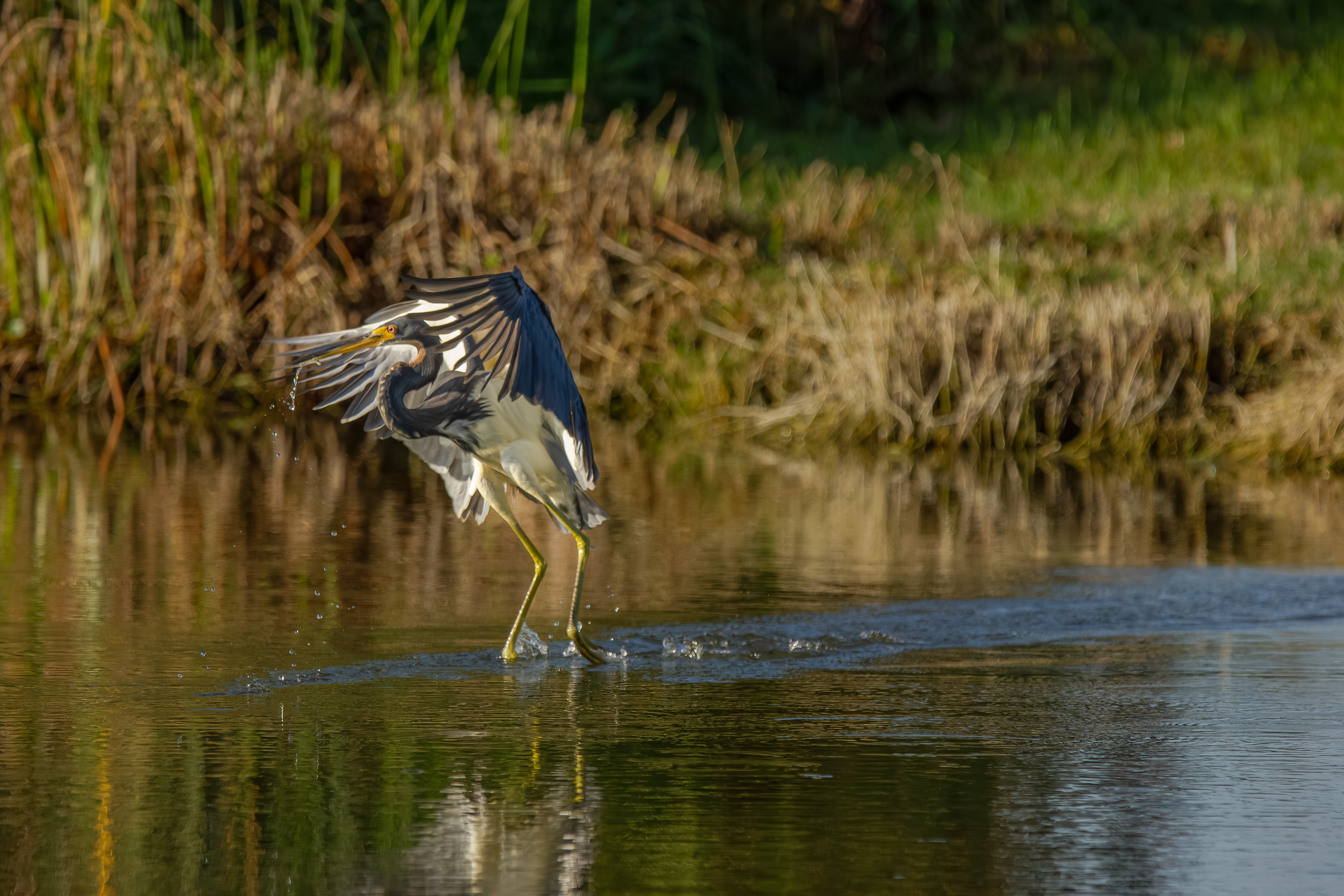 Unlike many herons that rely on patient stillness, the Tricolored Heron is an active hunter, often seen running, hopping, and lunging through shallow water.