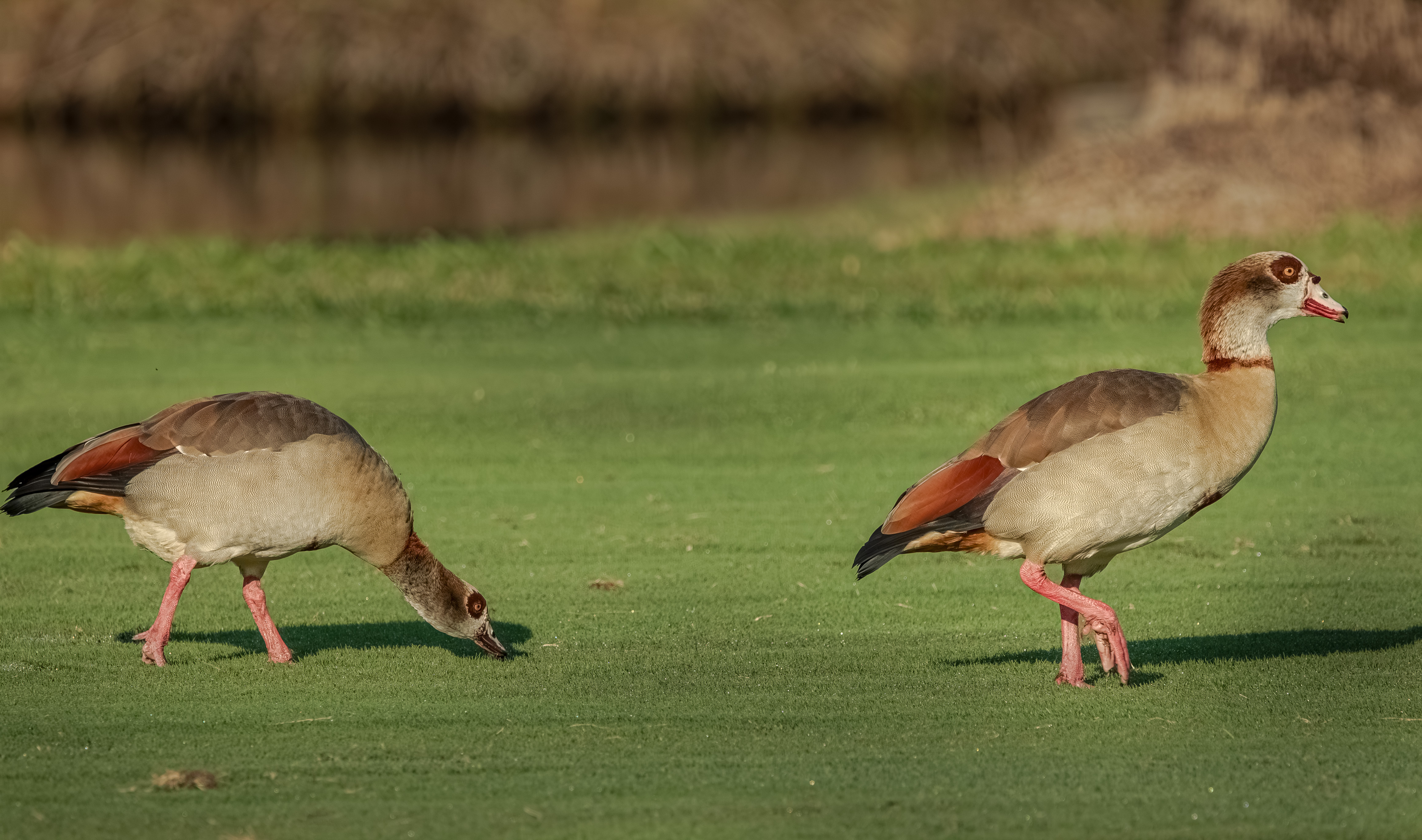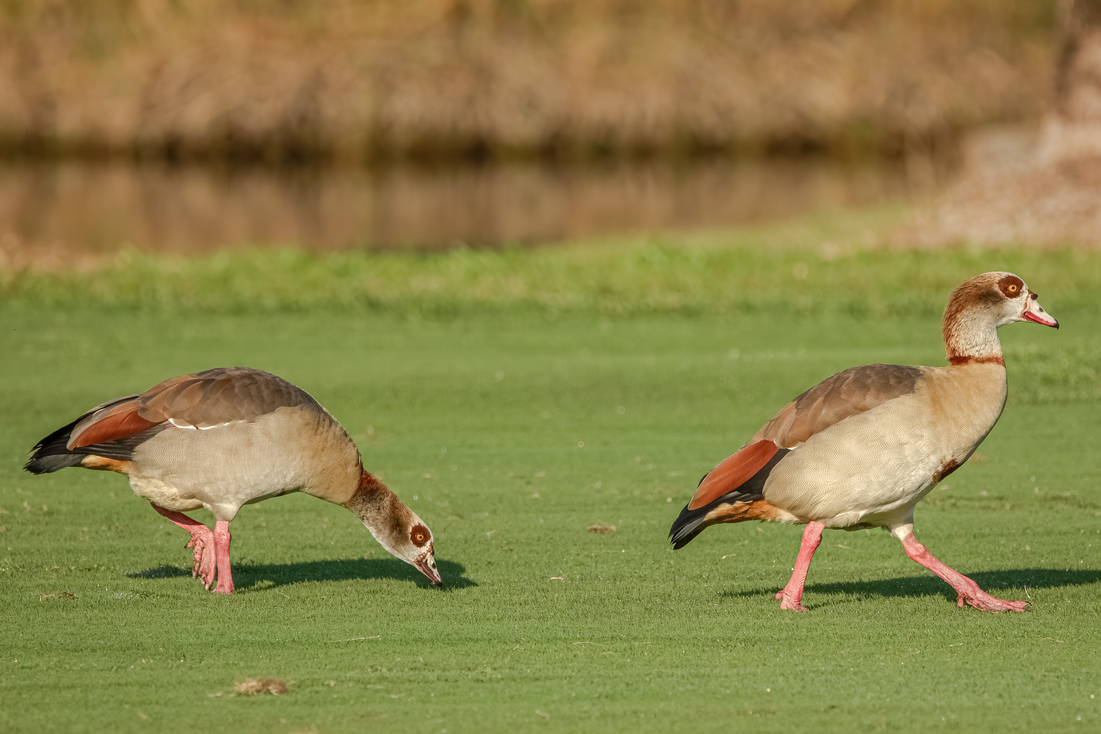 Egyptian Geese are primarily herbivorous, but opportunistic.